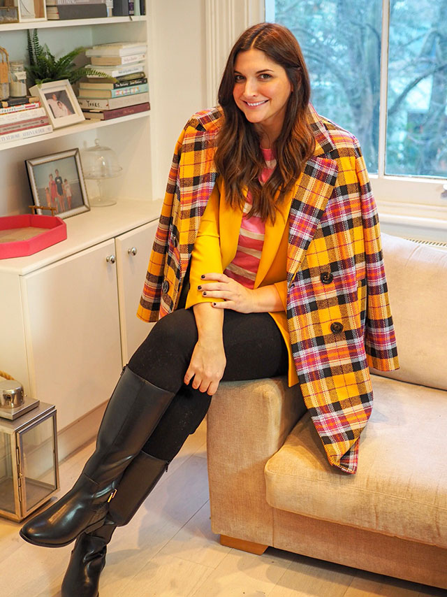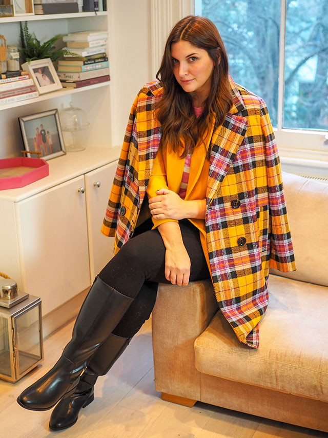 360 Stretch black denim, Yellow Blazer, Pink Shirt, Plaid Coat