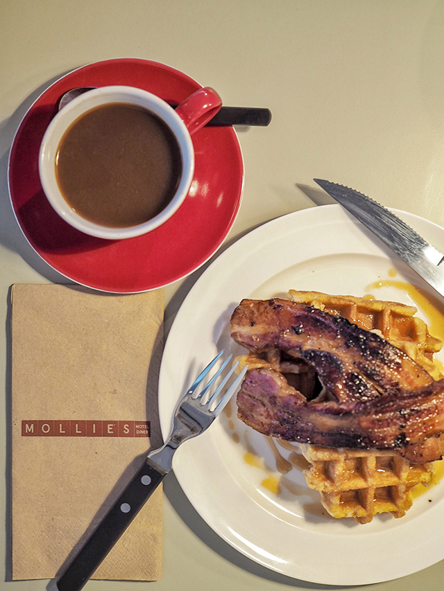 After a few perfectly mixed margaritas and more food than I ever thought was possible to eat, I retired for the evening to my room. It was snowing outside as I closed the curtains and tucked myself into the crisp white sheets. A 7am alarm had me up and about to pack for the return to London. There was just enough time to pop back over to Mollie’s Diner for breakfast before leaving. Coffee with waffles and large rations of bacon acted as my fuel to see me through the quick journey home, and just like that is was all over. But, Mollie’s remains. However, it won’t be the only Mollie’s in the country for long. New locations are popping up in Bristol and Manchester later this year. Could this be the future of UK roadside stops? Let’s wait and see, but it’s looking likely.