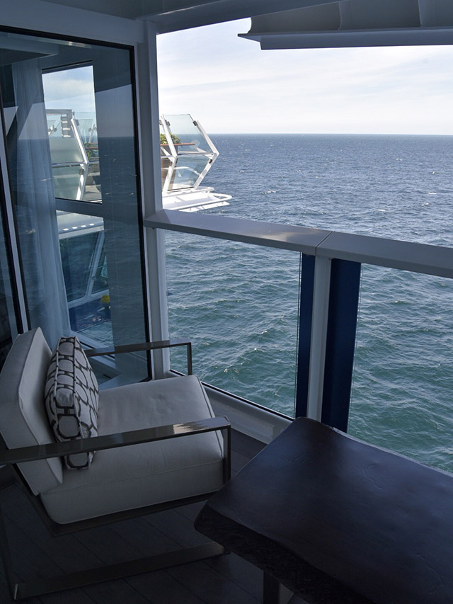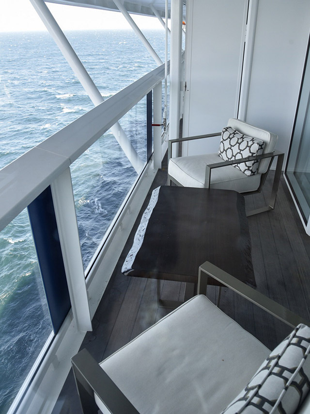 Back to the bedroom I go, where I do what I always do first on any cruise ship. I swing open the doors to the balcony. This is a double balcony room, with spaces, featuring unobstructed views of the ocean, in both the living room and bedroom. The joy of sleeping with an ocean breeze blowing in over the bed makes for the best night’s sleep you’ll ever have. Trust me on this one. So, I’m basically already counting down the hours until I can crawl into that oversized bed and listen to the ocean waves crashing against the ship.