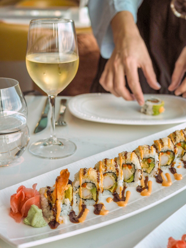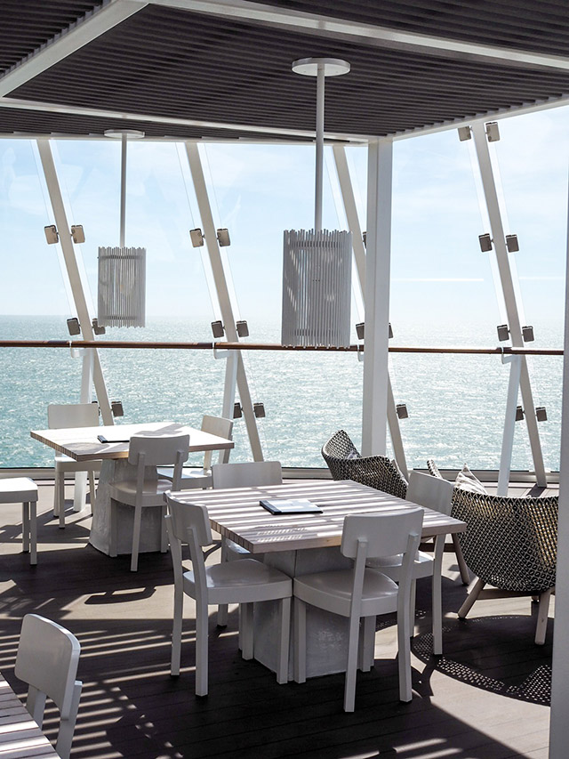 My first port of call is dinner in the suite class restaurant, Luminae. There were quite a few celebs on board, sadly that I’m not allowed to mention, and they seemed to all be there, sipping gorgeous looking cocktails and enjoying one another’s company. I was seated with other press on the night and enjoyed a wonderful three course meal, with wine pairing, as the ship left Southampton and began its journey out and about in the Channel. The meal started with burrata and freshly sliced tomatoes and basil – heaven on a plate. From there it was onto Filet Mignon followed by grilled pears. I left wondering if I should have packed clothes that were larger in size. Eating like this for three days may keep me from wriggling into a few dresses.