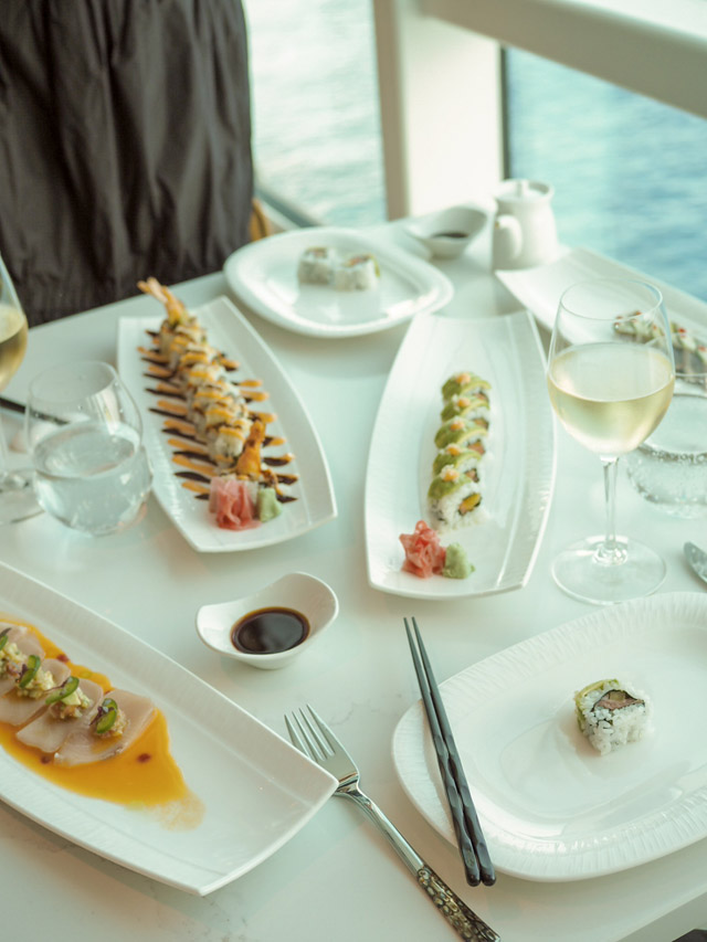 For lunch, I head back to the room to file a few pieces online and William suggests ordering some room service while I’m working. He is trouble for my dress size! “The burger,” he declares, “is amazing.” I then remember I haven’t asked about where the TV is in the bedroom. With one flick of a button, a TV comes down from the ceiling and I gasp, which I think surprises even William. The TV was in the ceiling all this time?! So, William leaves, I grab a quick shower and decide to take a disco nap before the food arrives, all the while with the TV on in the background. Twenty five minutes later, I’m awake, I have a movie on and the food has arrived. My butler was right. The burger is noteworthy and hot. Sorry if I keep mentioning the temperature of the food, but it is so hard to get room service right in even a hotel that’s on dry land. Doing the same aboard a ship with thousands of people seems impossible. But, they make it happen every single time.