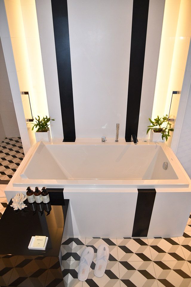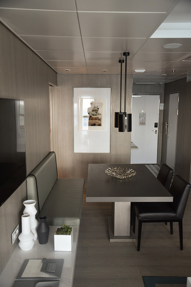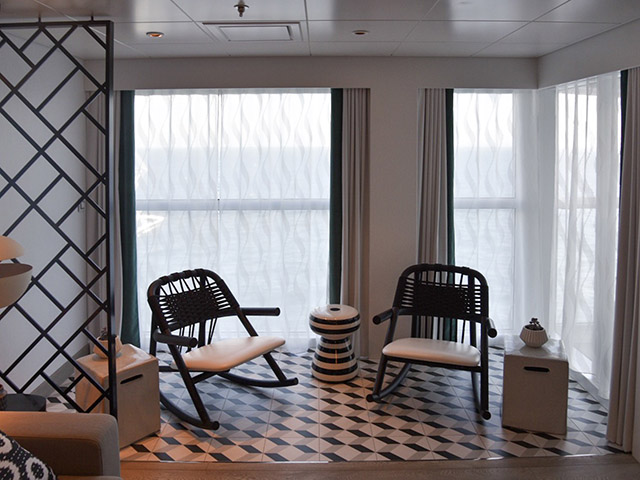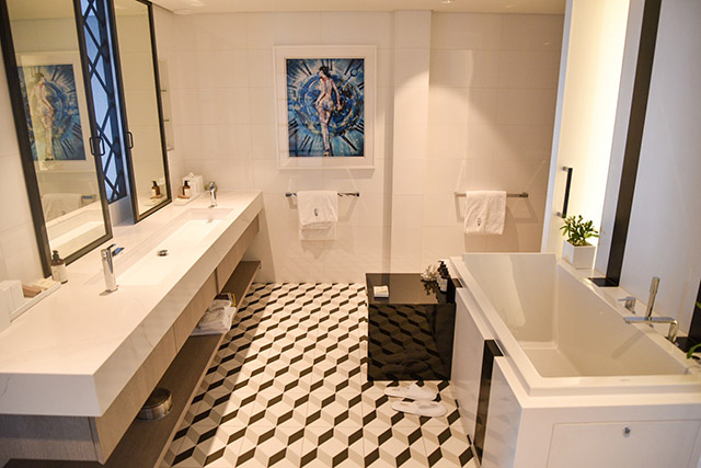 Into the bathroom I go, where a bathtub of a monstrous size is waiting. I don’t think I’ve ever seen a bath so big on any cruise ship, ever. It is the main feature in the space, until you turn around and notice that the double sink, which must be at least six feet in length, has retractable screens that open to showcase a view of the ocean. You can brush your teeth in the morning and watch as the ship sails into new destinations. Brilliant. Absolutely brilliant.