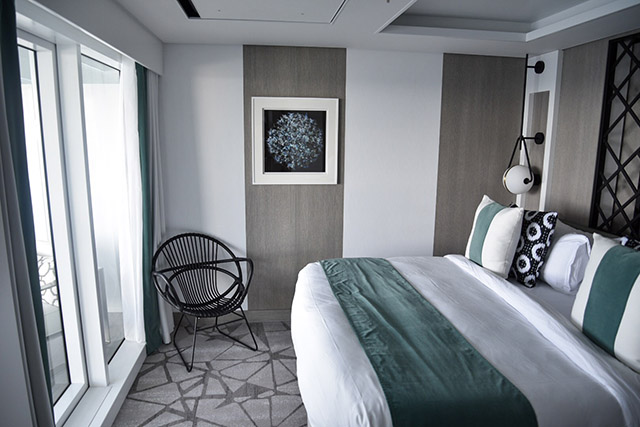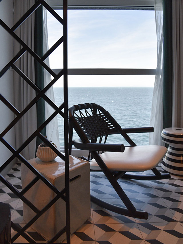 I walk into my room and the first thing that springs to mind, I say out loud. “Kelly Hoppen, you absolute goddess. You’ve only gone and created the dream space.” Yes, all the suites aboard Celebrity Edge are designed by our London favourite, interiors guru Kelly Hoppen. The Royal Suite aboard Celebrity Edge is an education in using monochrome for sophisticated interiors. Even the tiles in the foyer are inviting and begging for a shoefie to share on Instagram. As I walk into the main room, I’m overcome by the size of the living area. A full kitchen table awaits, sitting across a mini kitchen area and full bar. Beyond that there is a sofa that sits opposite a massive television that I’m pretty sure I won’t get a chance to turn on for the duration of my cruise. I’ll be too busy looking in front of me, sitting on the balcony in front of the sofa, that has two rocking chairs and a full view, floor to ceiling, of the ocean out in front of me. I note the bottle of champagne chilling on the coffee table and the finger foods that have been laid out for my arrival and begin to move into the bedroom and bathroom area. As I step into the bedroom, the doorbell to my suite rings.