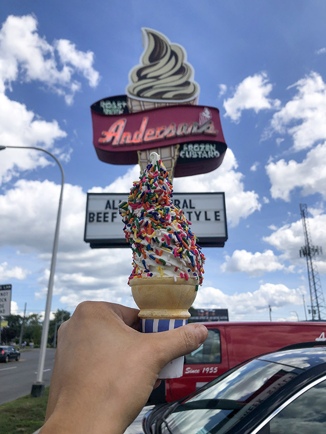 Anderson’s Frozen Custard will come in handy for a few things. If your mouth is on fire from too many hot wings, head here. If you’re in need of a sweet treat, head here. If you want to go and pop into a place that feels like you’ve stepped back in time fifty years, pull in here. Order a large frozen custard, dare to be great and cover in sprinkles, and watch all your worries disappear.