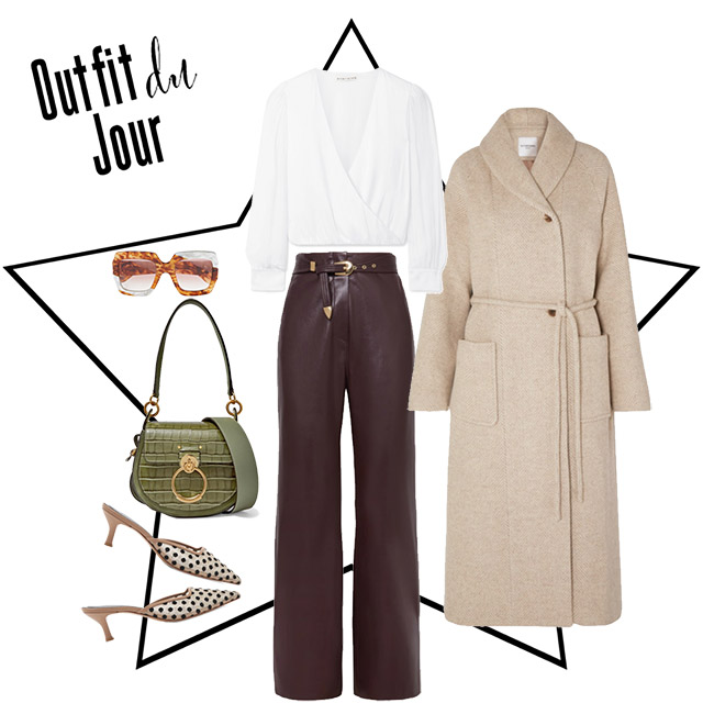 Shop the look: White Top, Leather Trousers, Overcoat, Sunglasses, Green Bag, Polka Dot Slides