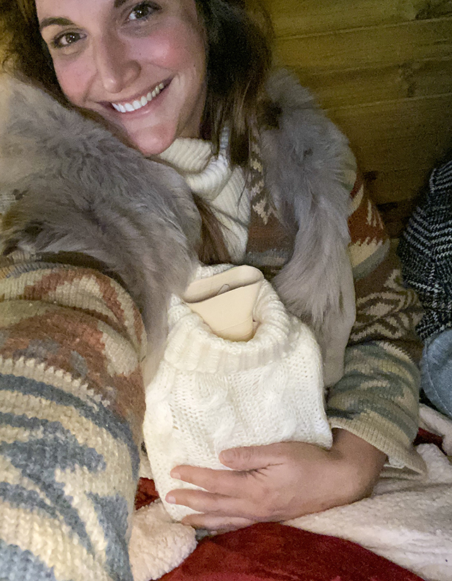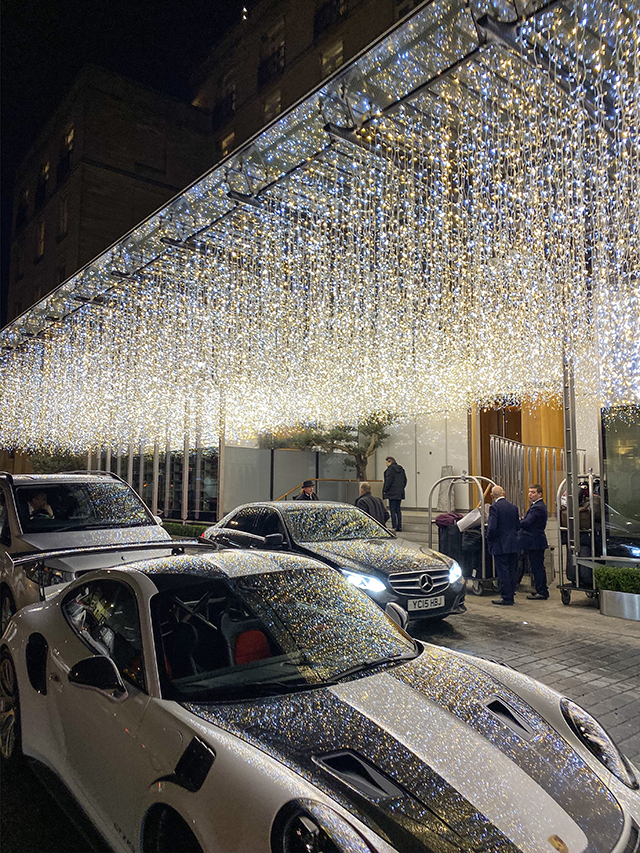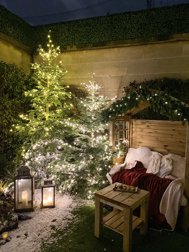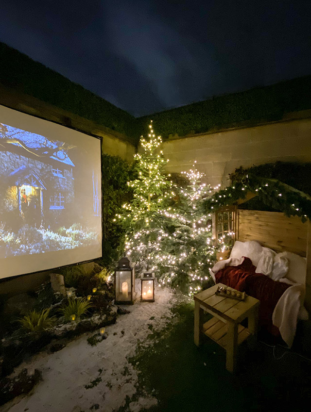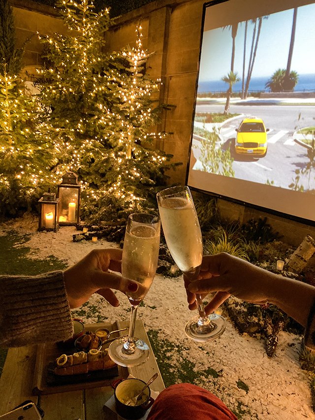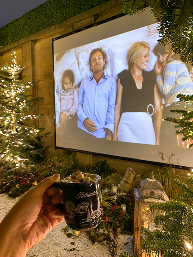 Can’t stop, won’t stop, with the Christmas content. When it comes to Christmas in London, I’m spoiled for choice. But, what I’m about to share will forever bring a teary smile to my face. Last night I had one of the most memorable moments to date in my London history. For two hours, I sat under the stars, with a heated blanket over my legs and a hot water bottle in my lap as The Holiday played on a giant screen in front of me. The Berkeley has taken holiday to the next level, not just by playing The Holiday, but by creating the most romantic way ever to watch it. Four mini chalets sit atop the roof of the hotel, for an intimate viewing of a timeless holiday rom com. From the moment you step onto the rooftop, you are no longer in London. You’re in the Swiss Alps, where Christmas trees are covered in snow, the air is scented with pine and your footpath is lit by large burning wax candles protected against the elements in hurricane lamps.
