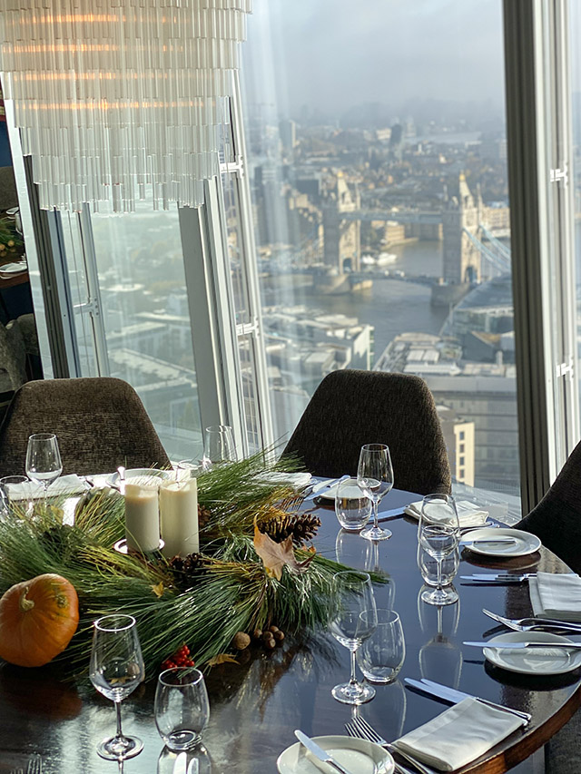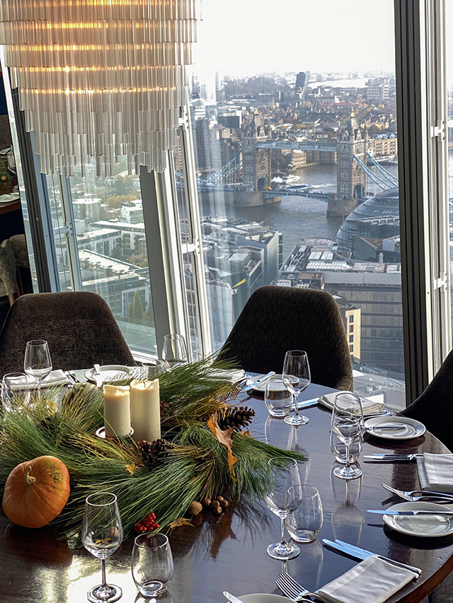 I have spent sixteen thanksgivings in London and each and every one has been entirely different from the next. It’s one of my favourite holidays of the year and the kick off to the entire festive season, really. My first few Thanksgivings, I was alone and, I’m not going to lie, it was a sad state of affairs. I would sit at my desk at work with a Pret Christmas Sandwich and say out loud what I was thankful for at that time, just like we used to do around my family dinner table on this day for so many Thanksgivings before. I’d eat my sandwich, take twenty minutes to think about what my family and friends were doing to celebrate at home, and then get on with my work day. Back then, Thanksgiving wasn’t a thing in London. No restaurants were really doing much of anything to celebrate and the only people that were putting on dinners were expats with big families and circles of friends to celebrate with. God, that makes me sound sad. It’s all just to say that I felt like a pretty lonely American on that day, years ago. But, as the years passed and more and more Americans moved to the big city, the restaurants started to pick up on the opportunity to recreate the feast for the ex-pat community. When I started FFG, and people clocked onto the fact that I was an American abroad, I was invited to a different Thanksgiving each year. So, for the past decade, I’ve had Thanksgiving in a different location every year. I’ve sat in Italian restaurants, Chinese restaurants, fine dining traditional British boltholes, hotels and more. I’ve run the gamut. But this year, well this year is like none other before it. For 2019, I helped curate a Thanksgiving feast that is not only the tastiest I have had since moving over here, but also one that is served with the most iconic London view in existence.