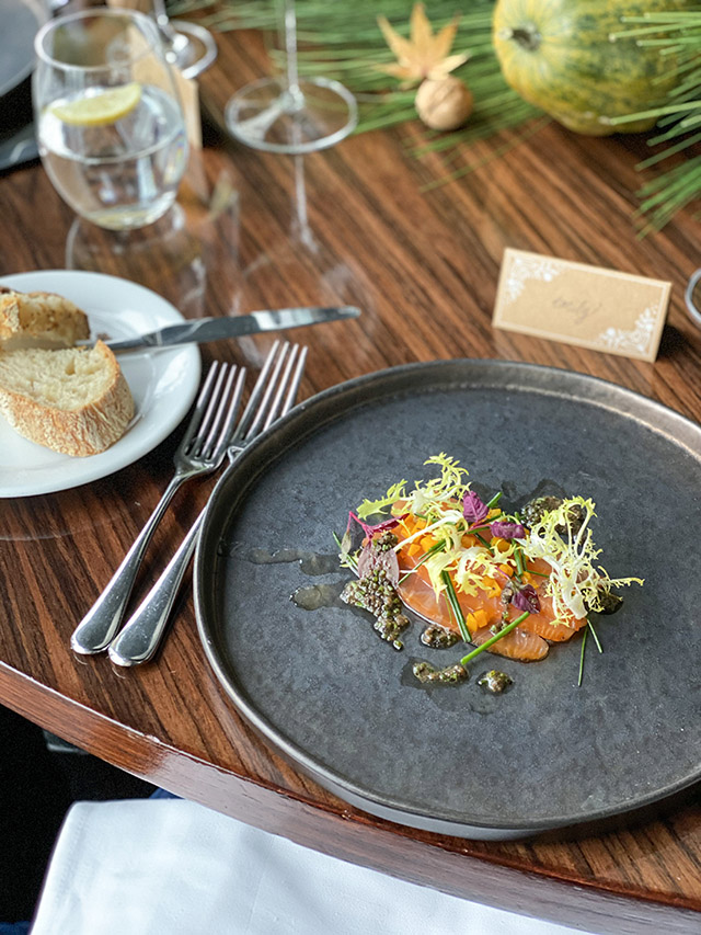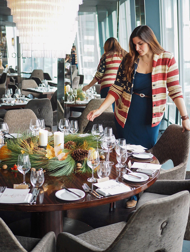 It all started when three American girls sat down and decided they wanted to do something special for the holiday. My dear friends Jess (you might know her as @jessonthames on Instagram) and Christina, from Aqua Shard, met me for breakfast one morning. The chat turned from the beauty of Aqua Shard and the unrivalled London view to how amazing it would be as a backdrop to a special meal. Thanksgiving came up and a plan was hatched. I didn’t know how we would pull it off or if it would work, but the three of us decided to try and make a Thanksgiving meal that we could offer to anyone who wanted to experience the holiday for the first time, or anyone who wanted a taste of home on a rather important holiday. So a Thanksgiving lunch was born. We worked with the talented chef, Anthony Garlando, to craft the perfect three course meal that incorporated a nod to British foods, while still paying homage to the traditional holiday servings. The end result was something too tasty not to share ahead of the big day. So, yesterday, we invited a group of 24 women to come to lunch. We set up three round tables in Aqua Shard’s private dining rooms, popped bottles of champagne to celebrate the occasion and waited patiently for our guests to arrive.