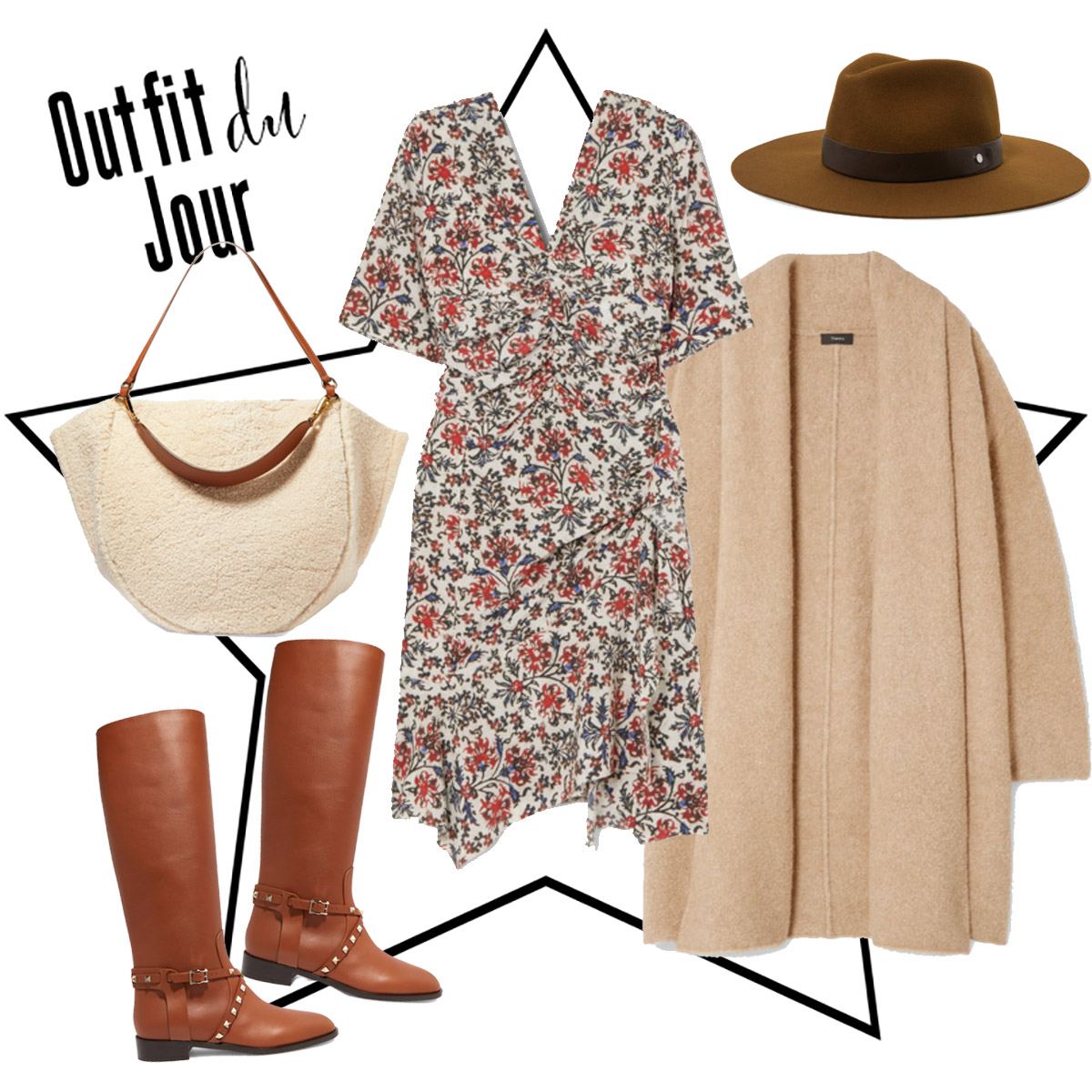 Shop The Look: *Note this post contains affiliate links Dress, Cardigan Sweater, Shearling Bag, Boots, Fedora Hat