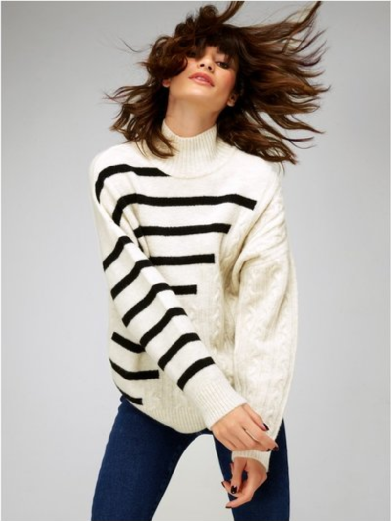 We’ve come this far in our relationship. I don’ t think I need to tell you that stripes are every woman’s friend. If someone tells you horizontal stripes are only for “thin women,” ask them if they also still believe the earth is flat. Morons. So yeah, that’s how I’m introducing today’s look, featuring a knit that’s both striped and cable knit. Call me crazy but I love it, and I figured you would too. How could you not? It’s absolutely inspired. It’s also from a brand that I’ve worked with over on Instagram (no, this is not a sponsored blogpost, but the instagram was so I’m being a good little girl and fully disclosing) and I’m sorta kind of obsessed not only with original bits like this, but also their price point. Oh, and everything this week is an additional 25% off, including this sweater. Just dropping that in there.
