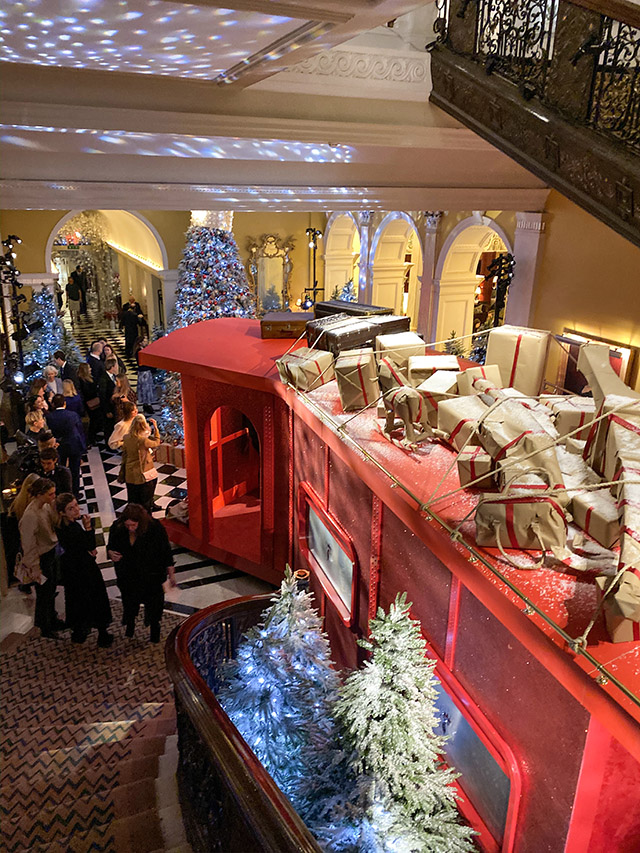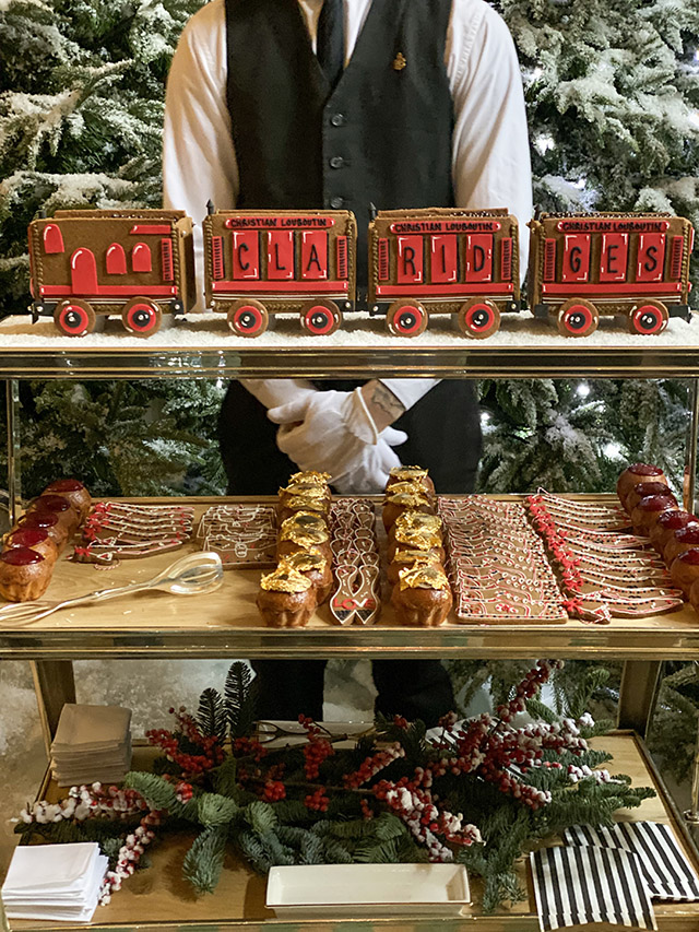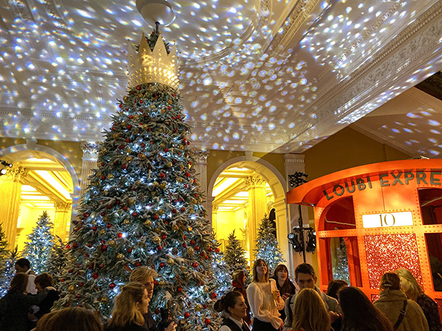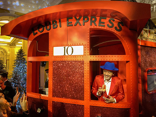 At exactly 8:30am this morning, as my red soled shoe stepped from the revolving door of the chilly London morning onto the plush and posh carpet of Claridge’s foyer, I was confronted with a winter wonderland with a most unexpected twist. The tree before me was dressed like a king, for indeed it did have the most spectacular crown resting upon its head. But below, decorated from base to tip, hung hundreds of baubles, nestled around gingerbread shoes with trademark Louboutin details. It wasn’t until I stepped up into the main reception of Claridge’s, however, that I spotted the real gem of this year’s Christmas tree. Alongside the rather famous and grand staircase, a train had appeared. The Loubi Express, a large red and life sized train carriage, complete with seating, for those wishing to drink their champagne in celebratory style, fills the lobby. As champagne, mince pies and truffle eggs on crumpets were passed around to the press, a man in a red suit, with a blue hat, descended from the floor above. Yes, the man of the hour, Mr. Christian Louboutin himself, was there to greet us all. He hopped onto the train, grabbed a glass of champagne and posed for his festive adoring fans in front of the dream tree.