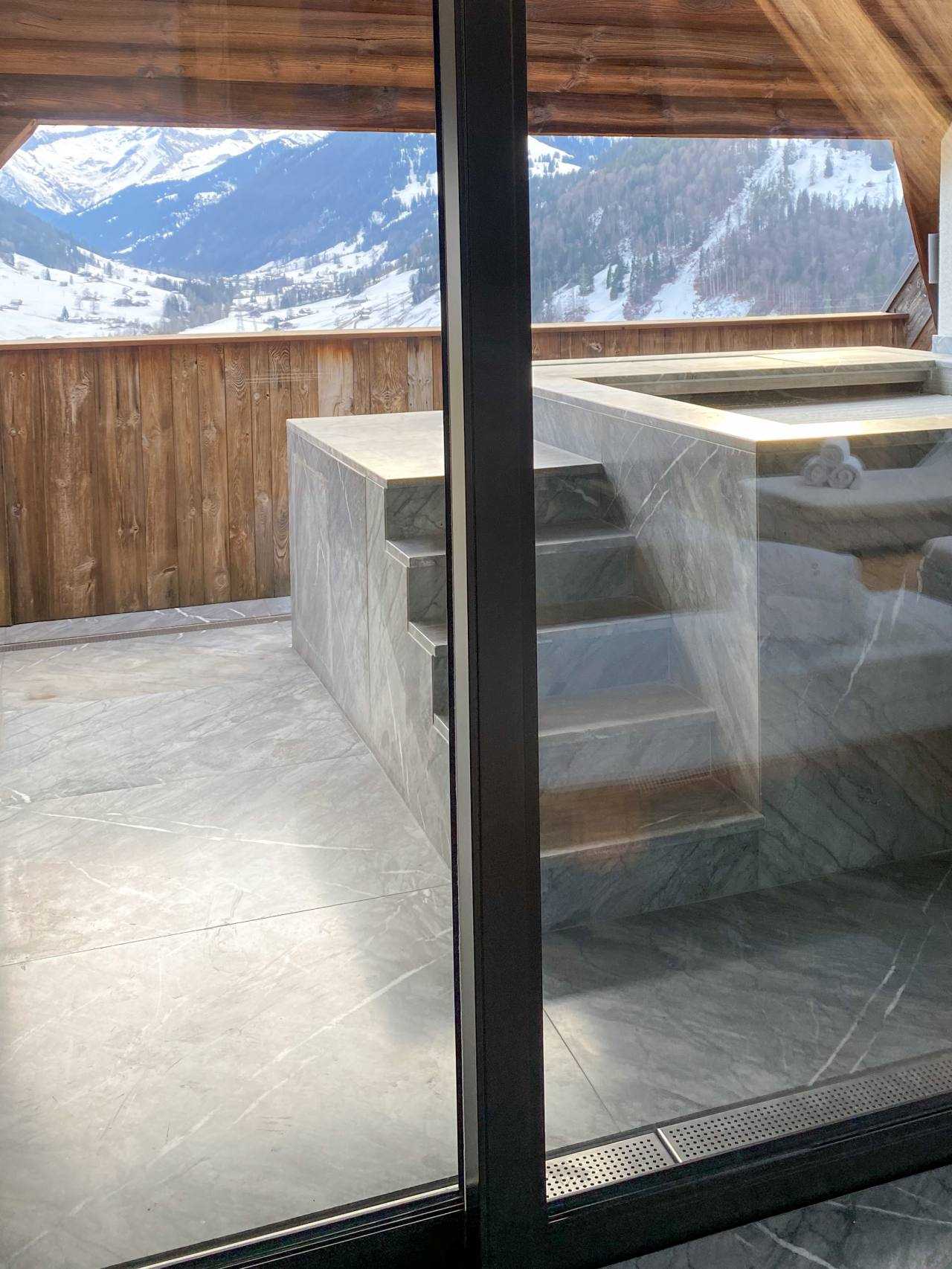 The entrance to The Alpina Gstaad is where we began to see a clear difference from the norm. Driving into the hotel is akin to driving into the Bat Cave or a James Bond baddy lair. If you’re picked up from the Gstaad train station by the hotel, you will be arriving in a Tesla SUV. As we silently drove into the hotel reception, we drove underground, past a waterfall and into a circular reception space. The doors rose up from the side of the vehicle and out we stepped, with staff awaiting our arrival, greeting us by name.