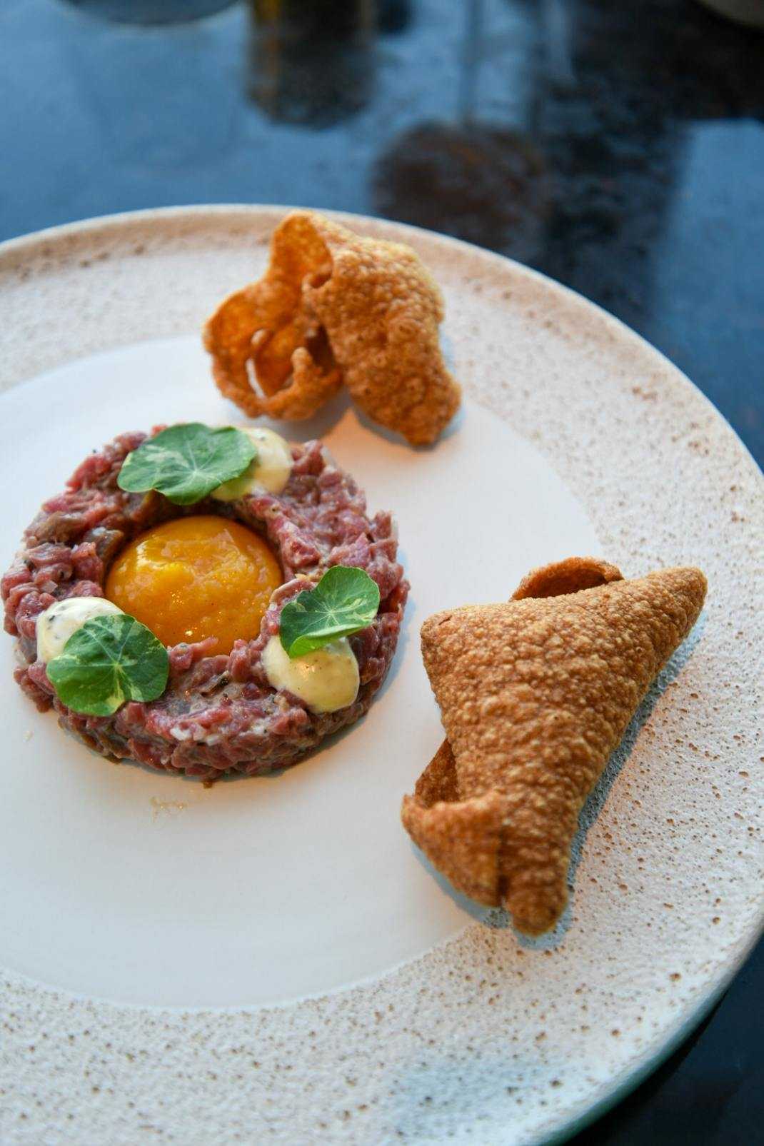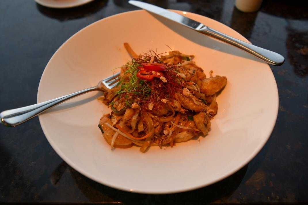 I set into taking pictures around the room and we finally came back together to put on our finest attire and head down to Ting for dinner. On the right side of the building, we sat in the restaurant just as the sun was setting, with a glorious view of Tower Bridge. When we first sat down, I couldn’t help but notice the ginormous shadow the Shard cast over the city. It was like nothing I had ever seen before, but it was beautiful and so mind blowing to think I was sitting atop that tall shadow caster, enjoying a perfectly spiced steak tartare and Pad Thai. Yes, Ting is a fusion restaurant, serving both English and Asian cuisine. We each decided to try one thing from both menus. I went English to start and Asian for main, and Steve did the reverse. We sat, cocktails or wine in hand, until the sun had faded away completely and the view was replaced with the twinkling city lights of London’s evening song. While the tables in the restaurant were placed so as to abide by social distancing rules, the atmosphere was no less spectacular. Both tourists and neighbourhood regulars all seemed grateful to be back and all too happy to laugh, converse, smile and relax in this setting.