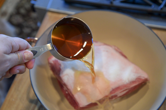 2. Place your meat in a deep covered casserole dish, fat side up.