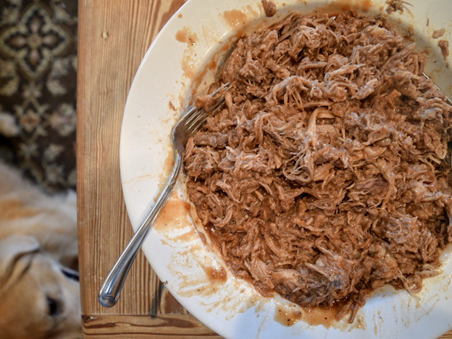 9. Finely shred the roast with two forks (pictures below to showcase sizing).